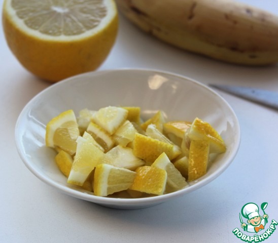 Лимон хорошо вымойте щеточкой, нарежьте произвольно (не очищая), зернышки удалите.