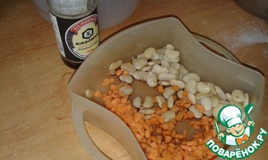 Морковь нарезать мелкими кубиками и перемешать с фасолью и соевым соусом