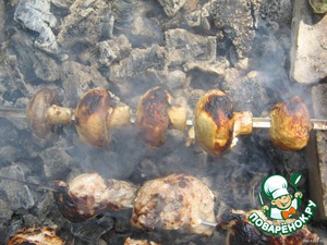 Теперь дело за костром. Когда он прогорит, нанизываем грибы на шампура и жарим над углями. Время жарки зависит от размера грибов, чем меньше, тем быстрее они будут готовы. Подавать можно с белым соусом (фото у меня нет, как и нет фото готовых грибов - не успела!), который делается очень легко: в майонез (здесь уже лучше не экономить) добавляем чеснок (нарезанный, натёртый, пропущенный через пресс - не важно), зелень мелко нарезанную любую, какую больше любите, перчим, перемешиваем и всё готово! Приятного аппетита!