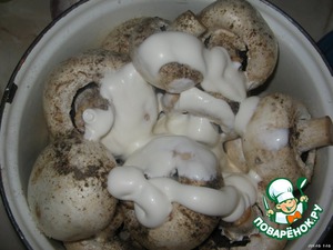Тщательно моем грибы. Шампиньоны лучше брать по возможности крупные. Но это идеальный вариант. С мелкими получается не хуже, только главное не пережарить! Грибы солим (слегка), перчим по вкусу и поливаем майонезом (для этого блюда подойдёт даже самый дешёвый майонез, и лучше, если он будет жидким).