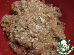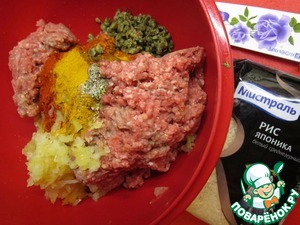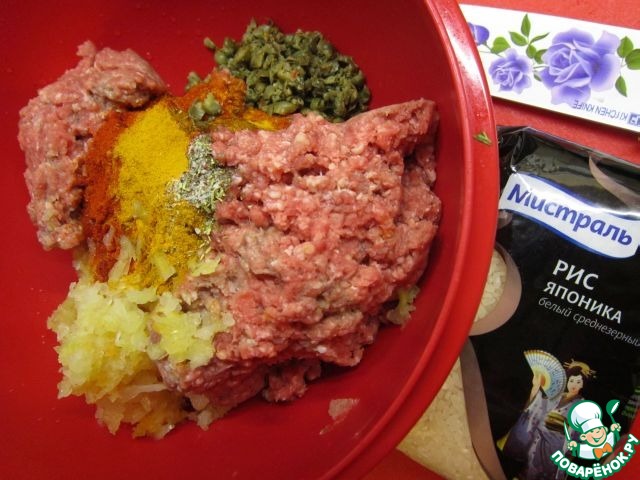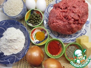 Мясной фарш+лук репчатый+яйца+смесь прованских трав+паприка+смесь карри+каперсы=хорошо вымесить.