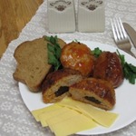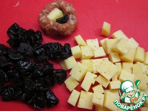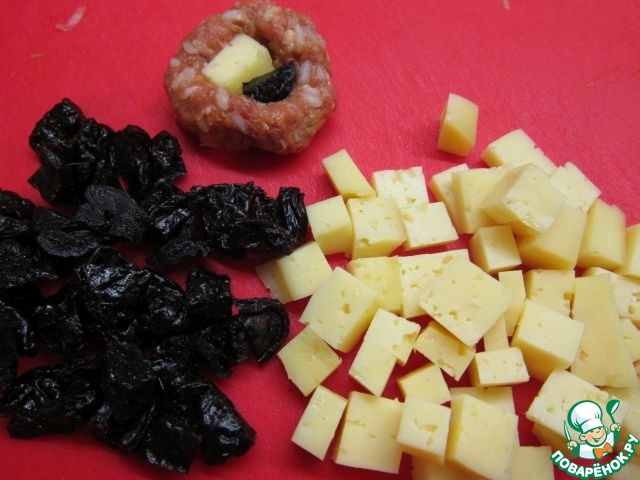 Формируя из фарша фрикадельки, в серединку каждой положить кусочек сыра и кусочек чернослива.