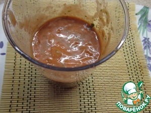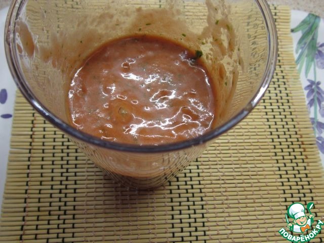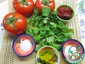 Соединить помидоры, кинзу, базилик, томатную пасту, соль, сахар, оливковое масло и взбить блендером.