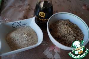 Гречу и семена льна измельчить в кофемолке в муку. Подготовить соевый соус от Киккоман.