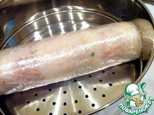 Рыбную заготовку поместите в пароварку (у меня кастрюля со вставкой, д=24 см). Готовьте примерно 45-50 минут. Готовый, горячий рулет аккуратно (не поломайте) выложите на тарелку, надрежьте немного пленку с двух сторон (внутри рулета образовалась жидкость), наклоняя тарелку, придерживая рулет, слейте жидкость.