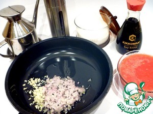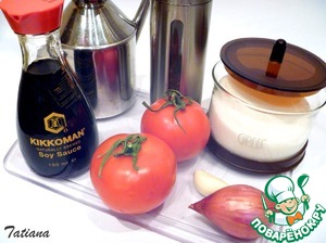 Лук-шалот и чеснок мелко порубите, помидоры разрежьте поперек, натрите на терке мякоть (шкурка останется в руке). В небольшом количестве масла потушите до полупрозрачности лук и чеснок, добавьте протертые помидоры, доведите смесь до кипения, уварите на медленном огне до загустения, добавьте соевый соус и немного сахара (по вкусу).
