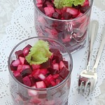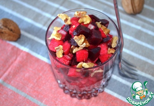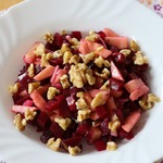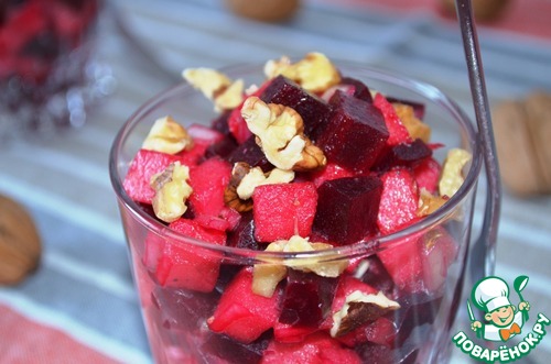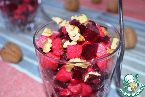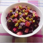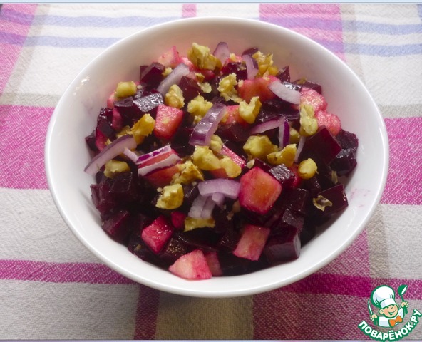 Свеклу почистить и нарезать небольшими кубиками, добавить к салату. -