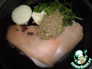 Рульку заливаем на пару часов холодной водой. После чего чистим, моем и ставим вариться на 1,5 часа. Добавляем любые "специи" - лук, коренья, приправы.