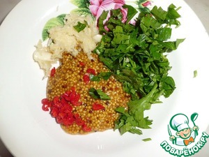 Мелко трем чеснок, добавляем горчицу, петрушку и половину (от общего количества) перца чили, мелко нарезанного.