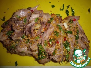 Готовую рульку немного охлаждаем, снимаем с кости. Пласт слегка надрезаем вдоль, делаем насечки, стараясь не повредить шкурку. Тщательно промазываем горчичной смесью каждый "уголок")))