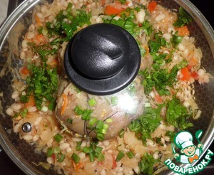 В центр кладем нашу рульку, посыпаем зеленью и оставляем на медленном огне под крышкой, минут на 10.
