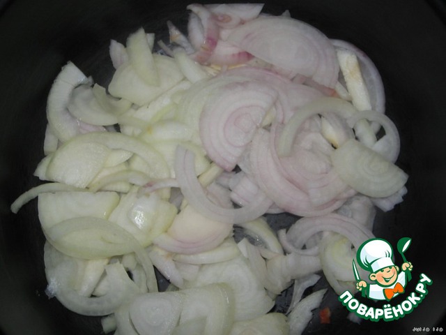 Нарезаем лук полукольцами и кладём его в посуду, где будет тушиться мясо.