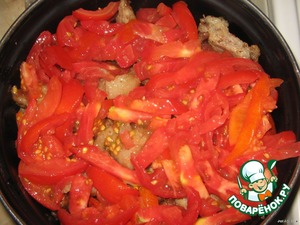 Сверху укладываем нарезанные соломкой помидоры и заливаем всё жидкостью со сковородки. Тушим на медленном огне минут 20 (до готовности овощей) под закрытой крышкой.