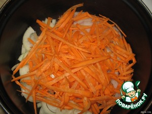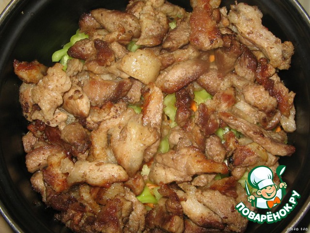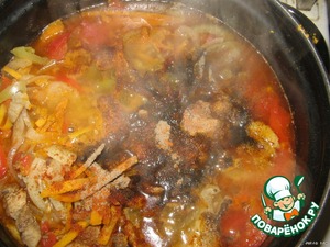 Всё это слоями складываем в кастрюльку. На овощи - мясо.