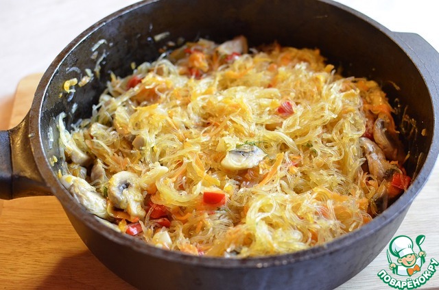 Далее, с фунчозы слить воду, просушить при помощи полотенца. И отправить в сковороду и обжаривать в течении 2-3 минут. Выключить огонь, сковороду накрыть крышкой и дать постоять и напитаться в течении 5 минут. Подавать к столу! Очень вкусно, мега вкусно!
