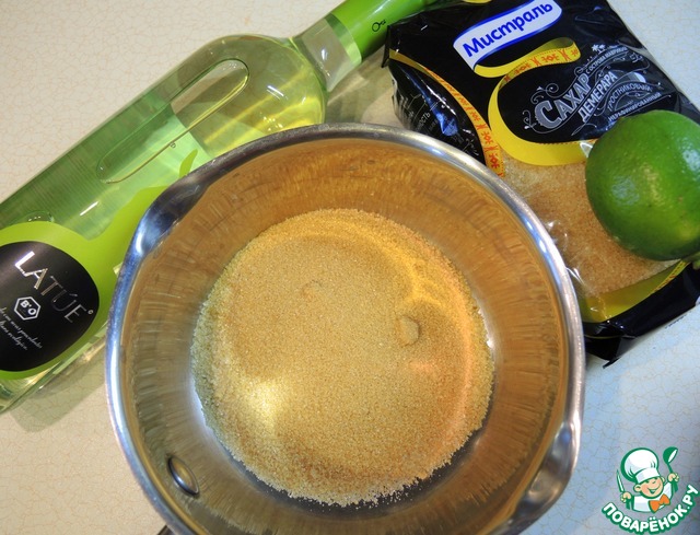 Для начинки положить в сотейник коричневый сахар демерара, влить белое сухое вино и сок лайма. Довести до кипения.