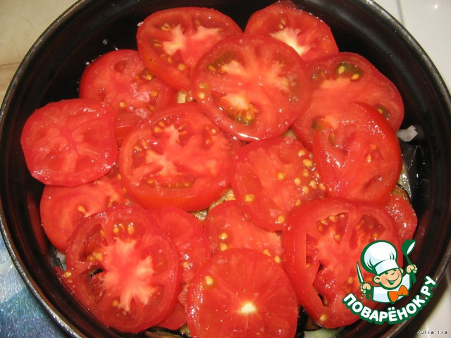 Помидоры нарезаем кружками и выкладываем последним слоем. Наливаем в кастрюлю воды, чтобы доходила до середины овощей, и ставим на медленный огонь тушиться, минут на 25-30.