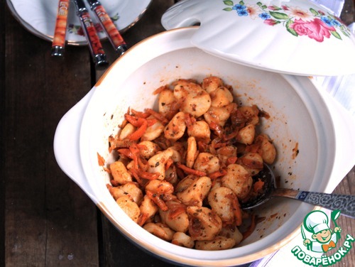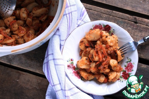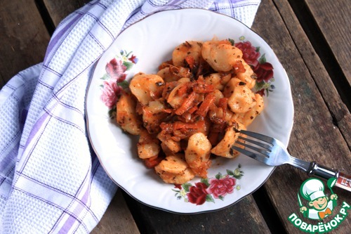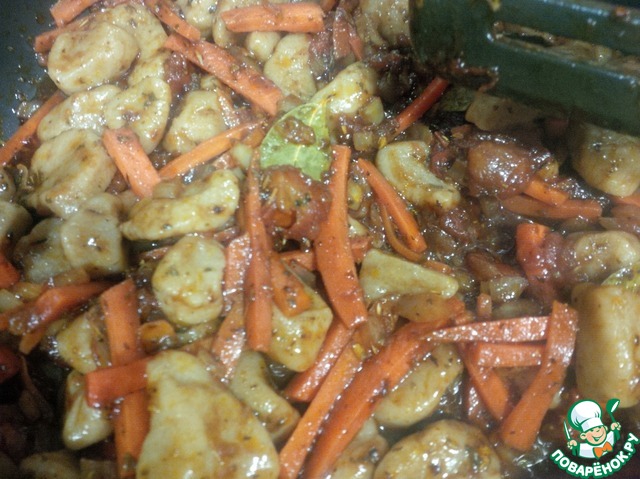 С детства очень люблю галушки из пельменного теста, прям фанат, особенно зажаренные на сковороде. На мамин вопрос "Что сегодня приготовить?" из моих уст был всегда один ответ: "Галушкиииииии..." Но эту любовь со мной и папа разделял и разделяет до сих пор. Когда семьей лепили пельмени, то всегда из остатков теста готовились галушки. Мама, видимо, специально замешивала теста больше. Я решила отойти от традиционного способа приготовления моих любимых галушек в жареном виде и приготовить их в постном варианте по-итальянски, использовав вместо макаронных изделий, тем самым оградить себя от поиска макаронных изделий без содержания яиц или яичного порошка. Нам понравилось, надеюсь, и Вам понравится.