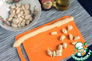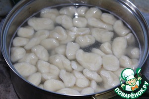 Сделать колбаски и нарезать пятачками 0,5 - 0,7 мм шириной. Поправить каждый пятачок и пересыпать мукой, чтобы избежать слипания.