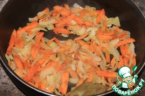 На сковороде разогреть масло подсолнечное, положить лавровый лист, добавить нарезанные репчатый лук и морковь. Все обжарить.
