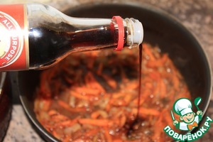 Когда жидкость начнет испаряться, добавить соевый соус "Kikkoman", по желанию поперчить и готовить до полной готовности моркови. Вынуть лавровый лист.