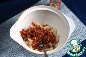 Добавить протертый консервированный томат и майоран. Перемешать и готовить.