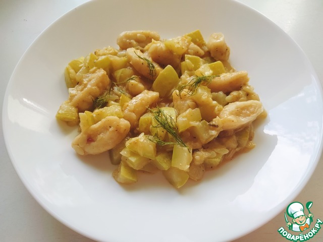 По вкусу посолить, поперчить. Готовые кабачки выложить на блюдо, сверху выложить готовые галушки. Блюдо готово.