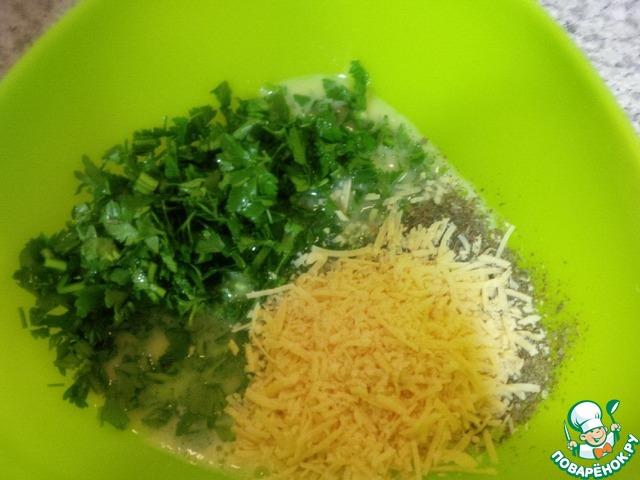 Лук снимаем с огня и ставим немного охладить. Вытираем излишки масла со скоровороды чтобы она лишь слегка была смазана маслом. Смешиваем все ингридиенты (яйца, специи, сыр, зелень, лук и т. д.), очень хорошо перемешиваем