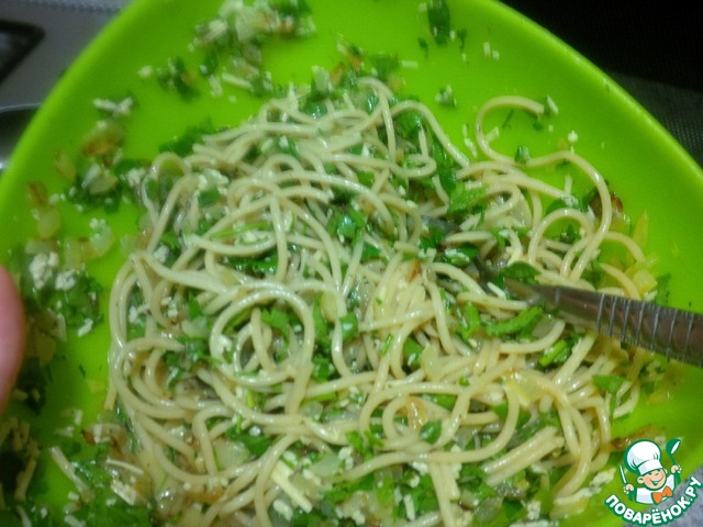 Добавляем спагетти. Опять очень хорошо перемешиваем. У меня спагетти цельнозерновые, поэтому такого цвета.
