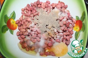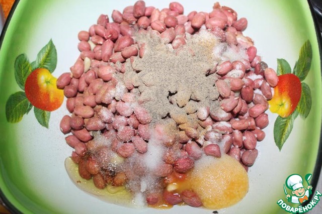 В арахис вбить яйцо, добавить соль, сахар, перцы и хорошо перемешать