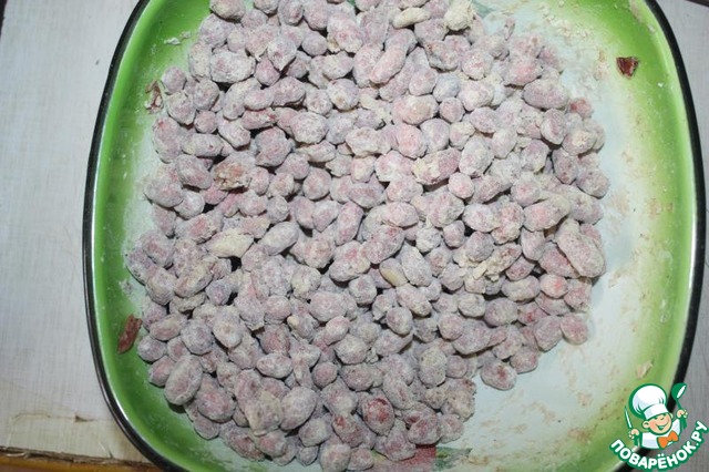 Всыпать муку и еще раз хорошо перемешать, чтобы мука равномерно покрыла арахис