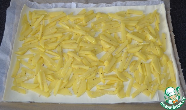 Тесто раскатать в прямоугольный пласт, выложить на тесто маринованный картофель.