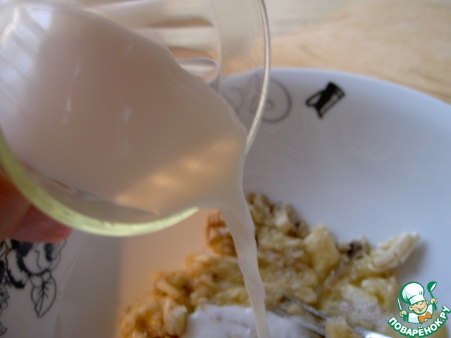 Влить молоко и также вилкой вмешать его в банановую массу