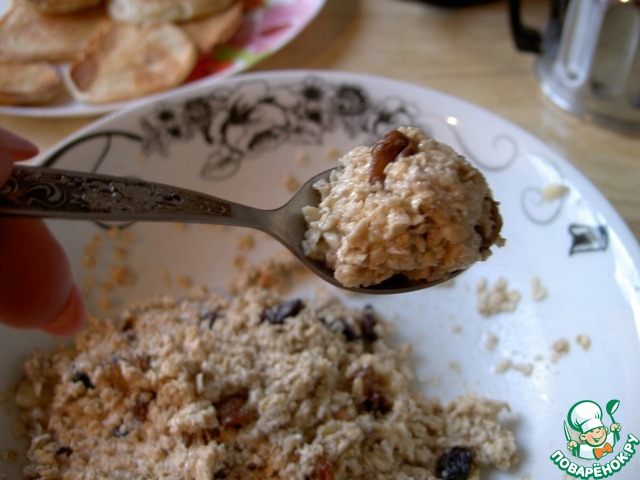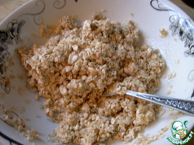 Затем понемногу всыпать овсяные хлопья, тщательно размять массу вилкой