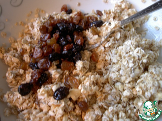 Делала из хлопьев долгого варения, изюма, сушеной клюквы и кокосовой стружки. Тесто настаивала минут 40, что хлопья разбухли лучше. Сахара можно было уменьшить или вовсе не добавлять. При том, что я сладкоежка.