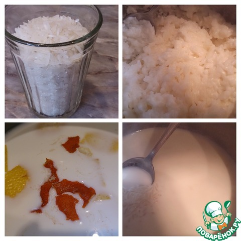 • Вскипятить молоко c цедрой лимона (у меня была ещё засушенная цедра апельсина, я добавила и её тоже), затем всыпать рис и щепотку соли. Уменьшить огонь и варить примерно 25 мин, подливая по необходимости молоко. Рис должен получится хорошо проваренным и мягким. Дать остыть, время от времени перемешивая рис.
