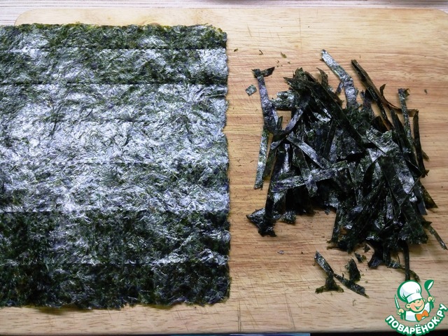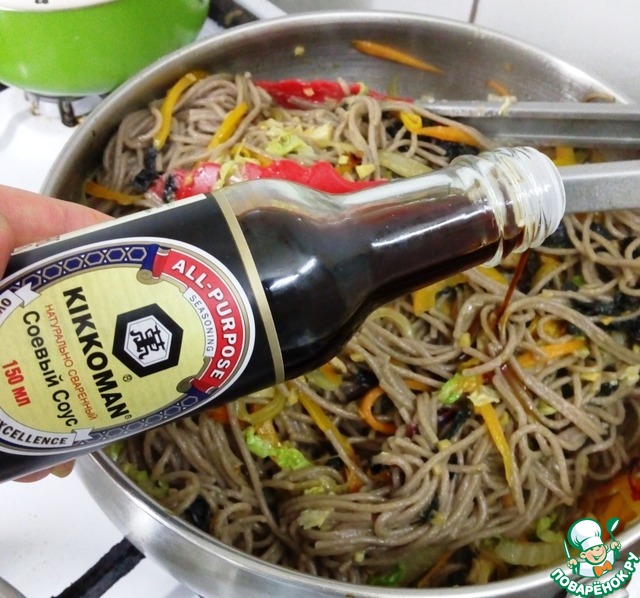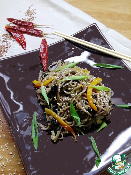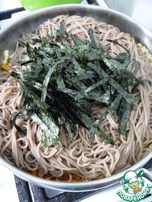 Перемешать и через минуту снять с плиты. Переложить к овощам лапшу и добавить нори. Перемешать и оставить постоять пару минут.