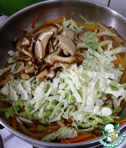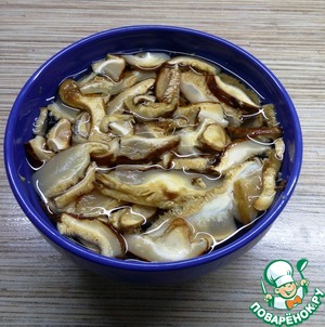 В первую очередь замочим грибы Шиитаке в холодной кипяченной воде на 45 мин (по инструкции). Грибы продаются в супермаркетах в отделе "Все для суши".