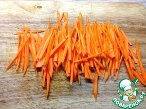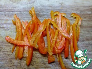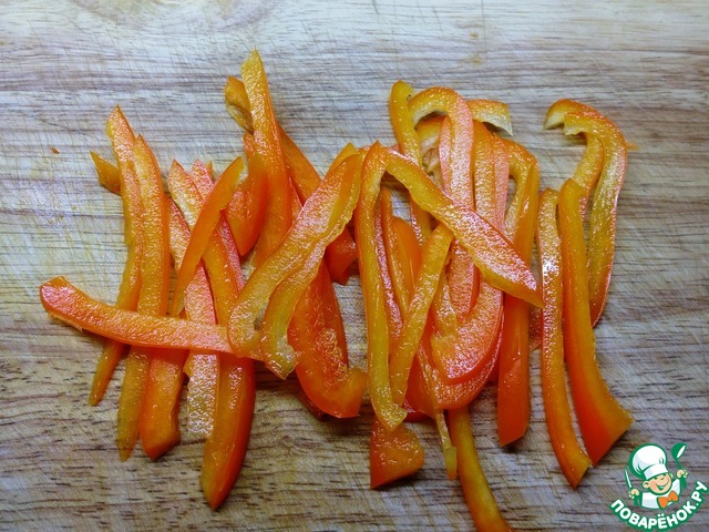 Болгарский перец так же нарезаем длинной, тонкой соломкой.