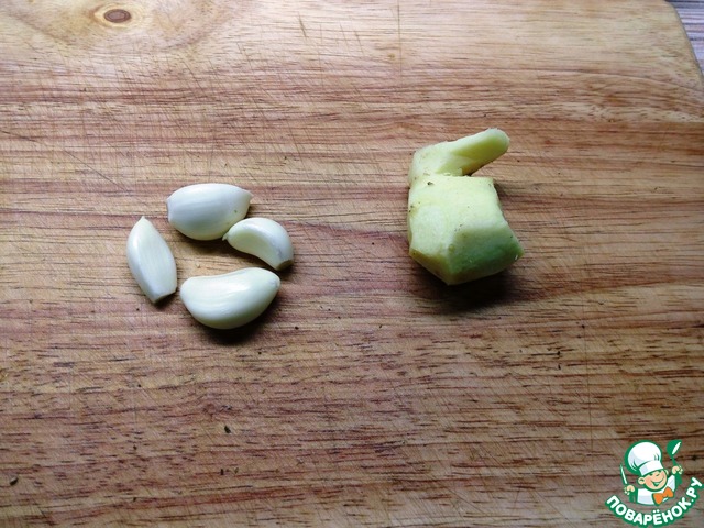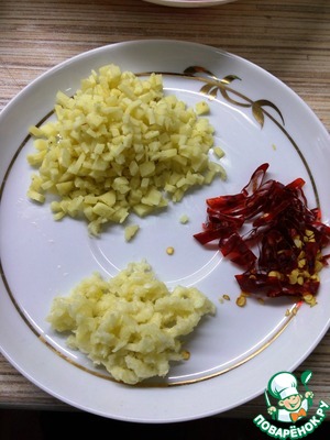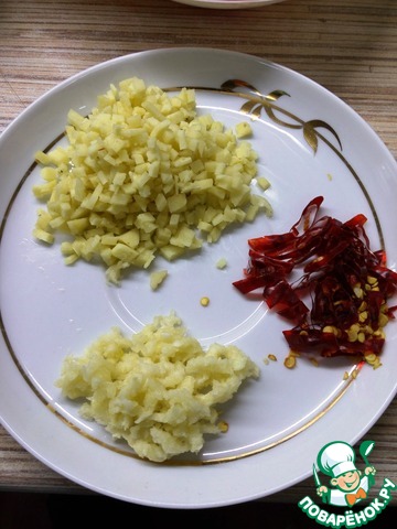 Чеснок измельчаем через пресс, имбирь нарезаем мелкими кубиками, по желанию можно натереть на терке. Перец чили измельчаем. У меня сухие стручки чили, так как свежий у нас сейчас совсем не острый