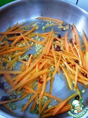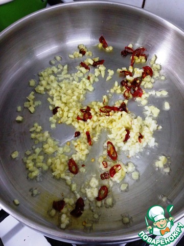 Пока лапша варится на сковороде разогреваем масло, добавляем перец чили, чеснок и имбирь.