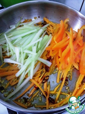 После добавляем болгарский перец и сельдерей. Перемешиваем.