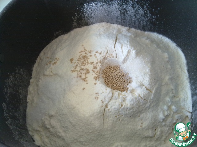 • Добавить просеянную муку, соль и сахар по вкусу, щепотку розмарина, сухие дрожжи. Помещаю ведерко в хлебопечку, включаю режим замеса теста. Даю тесту увеличиться в объеме примерно в 2-3 раза.