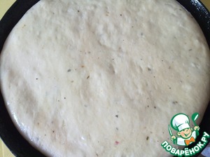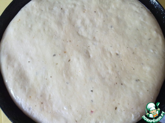 • На смазанную оливковым маслом форму выложить тесто, разровнять по всей поверхности формы.