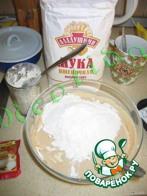 Добавить яйца, ванилин, масло, шоколад (порезанный маленькими брусочками), муку и разрыхлитель. Все хорошо перемешать