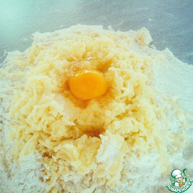 просеять муку, добавить натёртый картофель, яйцо, соль.. -