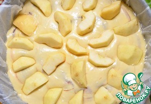 Выкладываем яблоки на пирог. Они должны касаться дна формы. Поскольку размер яблок достаточно крупный, то они погрузились в тесто на половину.