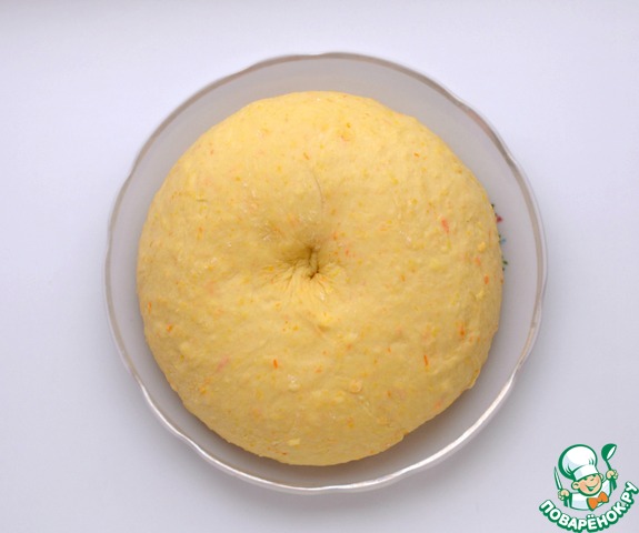 Сделать углубление в центре, влить апельсиновый сок, желтки, растопленное масло, молоко, соль, сахар и ром. Вымесить тесто руками до однородности. Не нужно вымешивать долго. Скатать тесто в шар, припудрить его мукой, завернуть в пленку и оставить в холодильнике отдохнуть на 4-6 ч. Достать тесто, дать немного согреться.