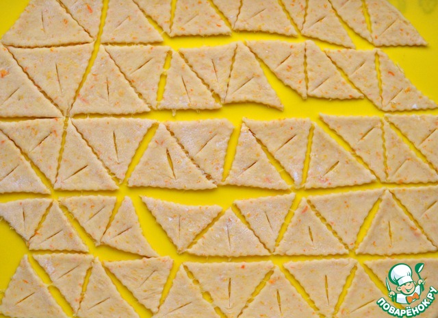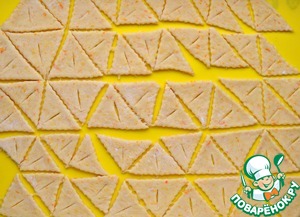 Стол подпылить мукой, раскатать тесто толщиной 0,5 см. Фигурным колесиком нарезать полосы шириной 6 см, разрезать их на треугольники. В центе каждого треугольника сделать надрез и протянуть через него угол.