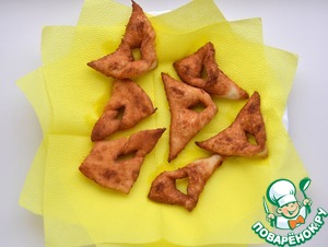 Жарить хворост по несколько штук за раз 1-2 минуты до золотистого цвета, переворачивая. Обсушить каждую порцию хвороста от масла на салфетках. Посыпать сахарной пудрой.